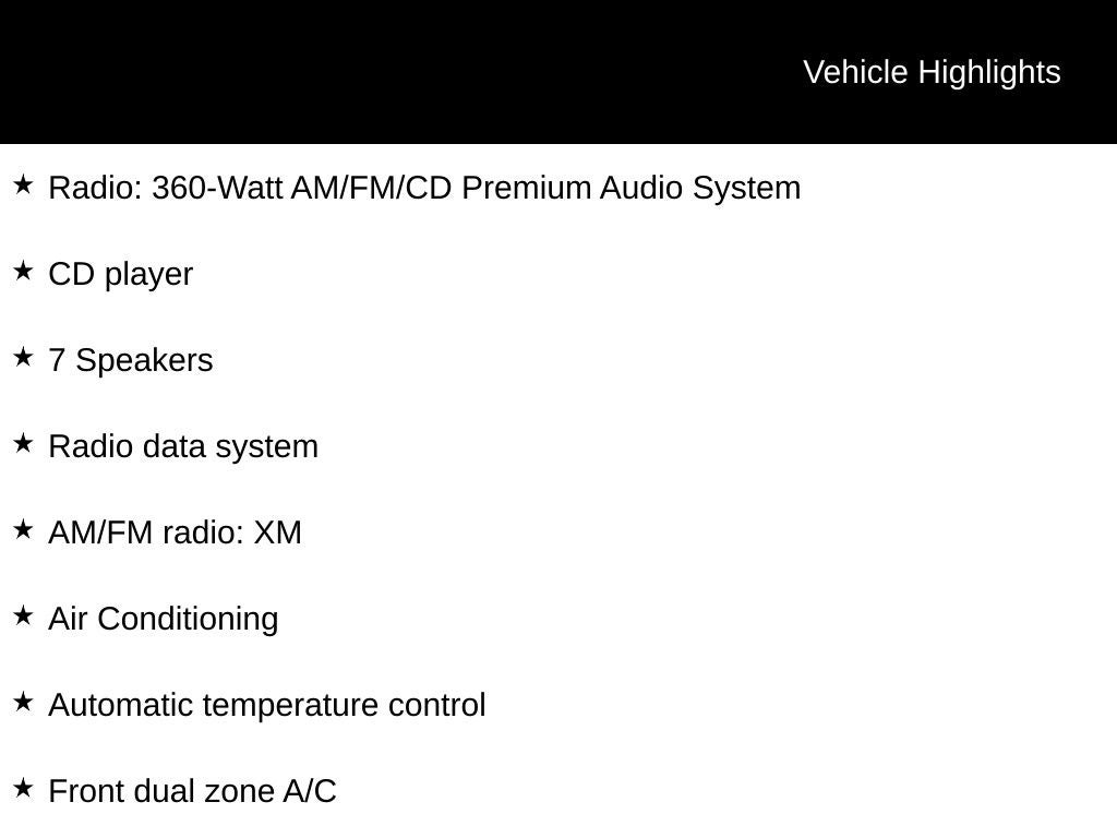 - 360-watt premium AM/FM stereo w/CD player -inc: (6) speakers, subwoofer, MP3/WMA playback, touch screen, auxiliary input jack, USB interface, radio data system (RDS), speed-sensitive volume control (SVC), Pandora compatibility
