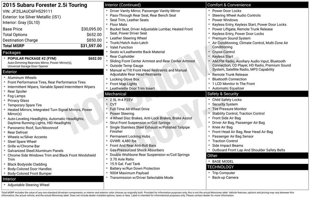 ** ONE OWNER ** MOONROOF ** 2015 Subaru Forester Ice Silver Metallic 2.5i Touring AWD Lineartronic CVT 2.5L 4-Cylinder DOHC 16V VVT Air Conditioning, Alloy wheels, Auto-Dimming Mirror w/Compass & HomeLink, Driver's Side Mirror, Exterior Mirror Hardware Kit, Exterior Parking Camera Rear, Front dual zone A/C, Front fog lights, harman/kardon 440W Amp & Speaker System, harman/kardon® Speakers, Heated Front Bucket Seats, Int. & Ext. Auto Dim Mirror w/Approach Lighting, Outside temperature display, Passenger's Side Mirror, Perforated Leather-Trimmed Upholstery, Popular Package #2, Power driver seat, Power moonroof, Premium audio system: harman/kardon, Radio: AM/FM Stereo w/HD & Single CD Player, Rear Bumper Cover, Remote keyless entry, Seat Back Cargo Net, Speed control, Turn signal indicator mirrors.
