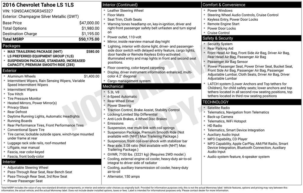 *** Max Trailering Package *** 2016 Chevrolet Tahoe LS RWD 6-Speed Automatic Electronic with Overdrive EcoTec3 5.3L V8 18 x 8.5 Aluminum Wheels, 2nd Row 60/40 Split-Folding Manual Bench, 3.42 Rear Axle Ratio, 3rd Row Manual 60/40 Split-Folding Fold Flat Bench, Air Conditioning, Integrated Trailer Brake Controller, Premium Smooth Ride Suspension Package, Rear air conditioning, Standard Suspension Package.