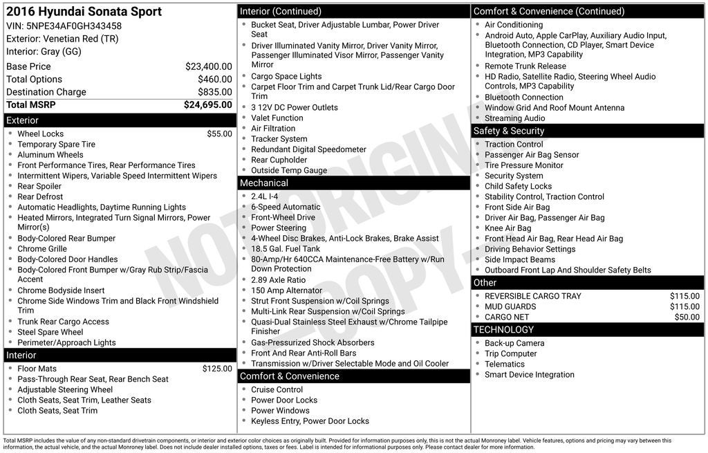 2016 Hyundai Sonata Venetian Red Metallic Sport FWD 6-Speed Automatic with Shiftronic 2.4L I4 DGI DOHC 16V ULEV II 185hp Gray Cloth, 4-Wheel Disc Brakes, 6 Speakers, ABS brakes, Air Conditioning, Alloy wheels, AM/FM radio: SiriusXM, Apple CarPlay & Android Auto, Brake assist, Bumpers: body-color, CD player, Chrome Exterior Door Handles, Coventional Sunroof, Delay-off headlights, Door Handle Welcome Light, Driver door bin, Driver vanity mirror, Dual front impact airbags, Dual front side impact airbags, Electronic Stability Control, Emergency communication system: Blue Link, Exterior Parking Camera Rear, Four wheel independent suspension, Front anti-roll bar, Front Bucket Seats, Front Center Armrest, Front reading lights, Fully automatic headlights, Hands-Free Smart Trunk, Heated door mirrors, Heated Front Seats, Illuminated entry, Knee airbag, Leather Bolster/Cloth Insert Seating Surfaces, Leather Wrapped Steering Wheel & Shift Knob, Low tire pressure warning, Occupant sensing airbag, Outside temperature display, Overhead airbag, Overhead console, Panic alarm, Passenger door bin, Passenger vanity mirror, Power door mirrors, Power driver seat, Power steering, Power windows, Proximity Key Entry w/Push Button Start, Radio data system, Radio: AM/FM/SiriusXM/CD/MP3 Display Audio, Rear anti-roll bar, Rear reading lights, Rear seat center armrest, Rear window defroster, Remote keyless entry, Security system, Speed control, Speed-sensing steering, Speed-Sensitive Wipers, Split folding rear seat, Spoiler, Sport Value Edition Package (1V), Steering wheel mounted audio controls, Tachometer, Telescoping steering wheel, Tilt steering wheel, Traction control, Trip computer, Turn signal indicator mirrors, Variably intermittent wipers, Wheels: 17 x 7.0J Aluminum Alloy, YES Essentials Premium Cloth Seating Surfaces.