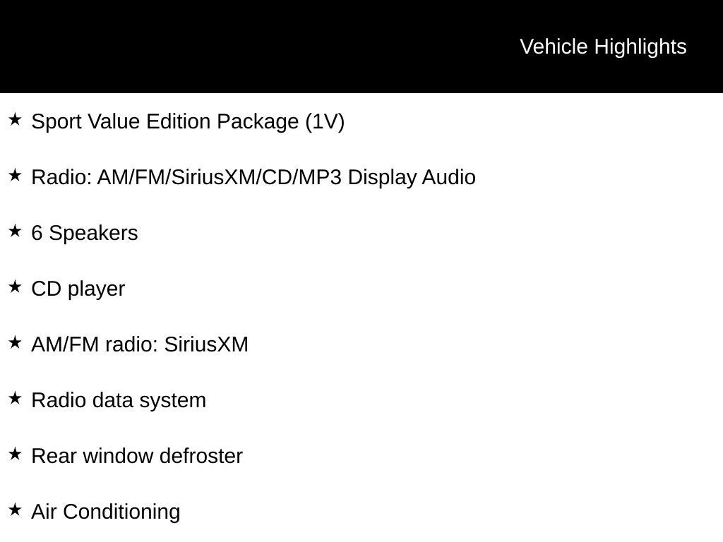 - Radio: AM/FM/SiriusXM/CD/MP3 Display Audio -inc: iPhone/USB and auxiliary jacks, 7-inch color touchscreen, Apple Car Play, Android Auto, HD Radio Technology w/multicasting, integrated Bluetooth® w/phonebook transfer and 6 speakers (2 front-door-mounted, 2 tweeters, and 2 rear)