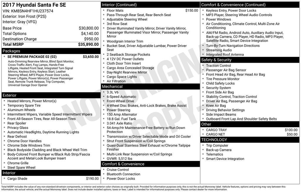 2017 Hyundai Santa Fe Iron Frost SE FWD 6-Speed Automatic with Shiftronic 3.3L V6 DGI DOHC 24V Gray, 18 x 7.5J Aluminum Alloy Wheels, 3.041 Axle Ratio, 3rd row seats: split-bench, 3rd Row USB Outlet, 4-Wheel Disc Brakes, 6 Speakers, ABS brakes, Air Conditioning, Alloy wheels, AM/FM radio: SiriusXM, Android Auto, Auto-Dimming Inside Rear-View Mirror, Automatic temperature control, Blind Spot Detection System, Brake assist, Bumpers: body-color, Cargo Cover, Cargo Net, Cargo Tray, Carpeted Floor Mats, CD player, Cloth Seating Surfaces w/Yes Essentials, Delay-off headlights, Driver door bin, Driver vanity mirror, Dual front impact airbags, Dual front side impact airbags, Dual Power Side Mirrors w/Turn Signal Indicators, Electroluminescent Gauge Cluster, Electronic Stability Control, Emergency communication system: Blue Link, Exterior Parking Camera Rear, Four wheel independent suspension, Front anti-roll bar, Front Bucket Seats, Front Center Armrest, Front dual zone A/C, Front LED Fog Lights, Front reading lights, Fully automatic headlights, Hands-Free Smart Liftgate w/Auto Open, Heated door mirrors, Heated Front Seats, Illuminated entry, Knee airbag, Lane Change Assist, Leather Seating Surfaces, Leather Wrapped Steering Wheel & Shift Knob, Low tire pressure warning, Manual Rear Side Window Shades, Multi-Adjustable Bucket Seats, Occupant sensing airbag, Option Group 02, Outside temperature display, Overhead airbag, Overhead console, Panic alarm, Passenger door bin, Passenger vanity mirror, Power door mirrors, Power driver seat, Power Height-Adjustable Front Passenger Seat, Power steering, Power windows, Premium Door Sill Plates, Proximity Key Entry w/Push Button Start, Radio: AM/FM/SiriusXM/CD/HD/MP3 Display Audio, Rear air conditioning, Rear anti-roll bar, Rear Cross Traffic Alert, Rear seat center armrest, Rear window defroster, Rear window wiper, Remote keyless entry, Roof rack: rails only, SE Premium Package 02, Security system, Speed control, Speed-sensing steering, Split folding rear seat, Spoiler, Steering wheel mounted audio controls, Tachometer, Telescoping steering wheel, Tilt steering wheel, Traction control, Trip computer, Variably intermittent wipers.