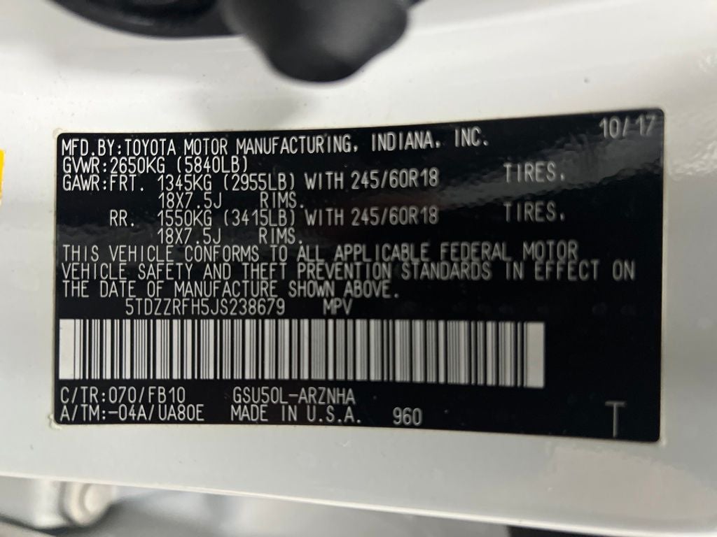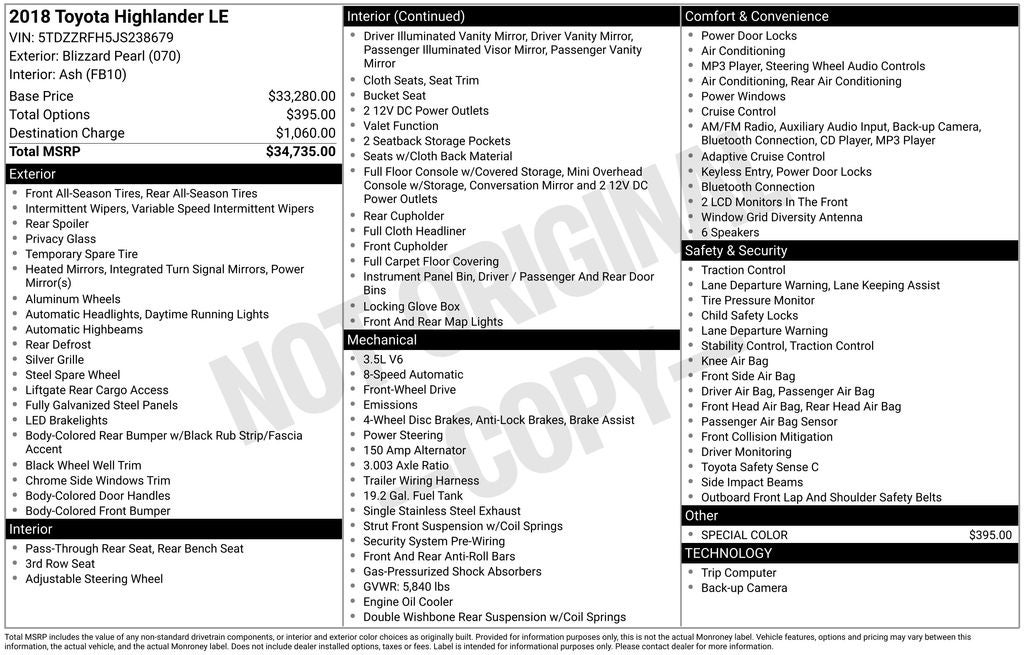 2018 Toyota Highlander Pearl LE FWD 8-Speed Automatic Electronic with ECT-i 3.5L V6 3.003 Axle Ratio, 3rd row seats: split-bench, 4-Wheel Disc Brakes, 6 Speakers, ABS brakes, Air Conditioning, Alloy wheels, AM/FM radio, Auto High-beam Headlights, Brake assist, Bumpers: body-color, CD player, Delay-off headlights, Driver door bin, Driver vanity mirror, Dual front impact airbags, Dual front side impact airbags, Electronic Stability Control, Exterior Parking Camera Rear, Fabric Seat Trim, Four wheel independent suspension, Front anti-roll bar, Front Bucket Seats, Front Center Armrest, Front reading lights, Fully automatic headlights, Heated door mirrors, Illuminated entry, Knee airbag, Low tire pressure warning, Occupant sensing airbag, Outside temperature display, Overhead airbag, Overhead console, Panic alarm, Passenger door bin, Passenger vanity mirror, Power door mirrors, Power steering, Power windows, Radio: Entune Audio, Rear air conditioning, Rear anti-roll bar, Rear reading lights, Rear seat center armrest, Rear window defroster, Rear window wiper, Reclining 3rd row seat, Remote keyless entry, Speed control, Speed-sensing steering, Split folding rear seat, Spoiler, Steering wheel mounted audio controls, Tachometer, Telescoping steering wheel, Tilt steering wheel, Traction control, Trip computer, Turn signal indicator mirrors, Variably intermittent wipers, Wheels: 18 Split 5-Spoke Machined-Face Alloy.