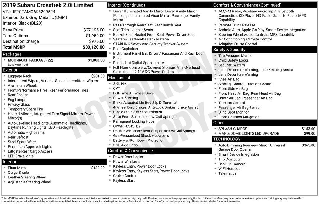 2019 Subaru Crosstrek Dark Gray Metallic 2.0i Limited AWD Lineartronic CVT 2.0L DOHC 6 Speakers, Active Cruise Control, All-Weather Floor Liners, Alloy wheels, Auto-Dimming Mirror w/Compass & HomeLink, Automatic temperature control, CD player, Driver vanity mirror, Emergency communication system: STARLINK Safety and Security, Exterior Parking Camera Rear, Front anti-roll bar, Front Center Armrest, Front fog lights, Fully automatic headlights, Leather Shift Knob, Leather-Trimmed Upholstery, Low tire pressure warning, Moonroof Package, Outside temperature display, Panic alarm, Passenger vanity mirror, Power Moonroof, Radio: Subaru Starlink 8.0 Multimedia Plus System, Rear anti-roll bar, Rear window wiper, Remote keyless entry, Security system, STARLINK/Apple CarPlay/Android Auto, Steering wheel mounted audio controls, Subaru Starlink Smartphone Integration, Telescoping steering wheel, Tilt steering wheel, Turn signal indicator mirrors, Variably intermittent wipers.