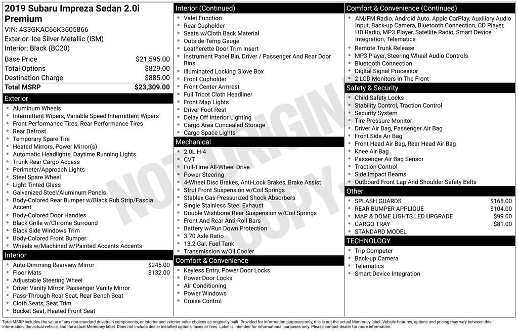 2019 Subaru Impreza Ice Silver Metallic 2.0i Premium AWD CVT Lineartronic 2.0L DOHC 16 Alloy Wheels, 6 Speakers, Air Conditioning, AM/FM radio: SiriusXM, Auto-Dimming Exterior Mirror (DIO), CD player, Cloth Upholstery, Delay-off headlights, Exterior Parking Camera Rear, Front Bucket Seats, Heated Front Bucket Seats, Outside temperature display, Radio: Subaru STARLINK 6.5 Multimedia Plus System, Remote keyless entry, Speed control, STARLINK/Apple CarPlay/Android Auto.
