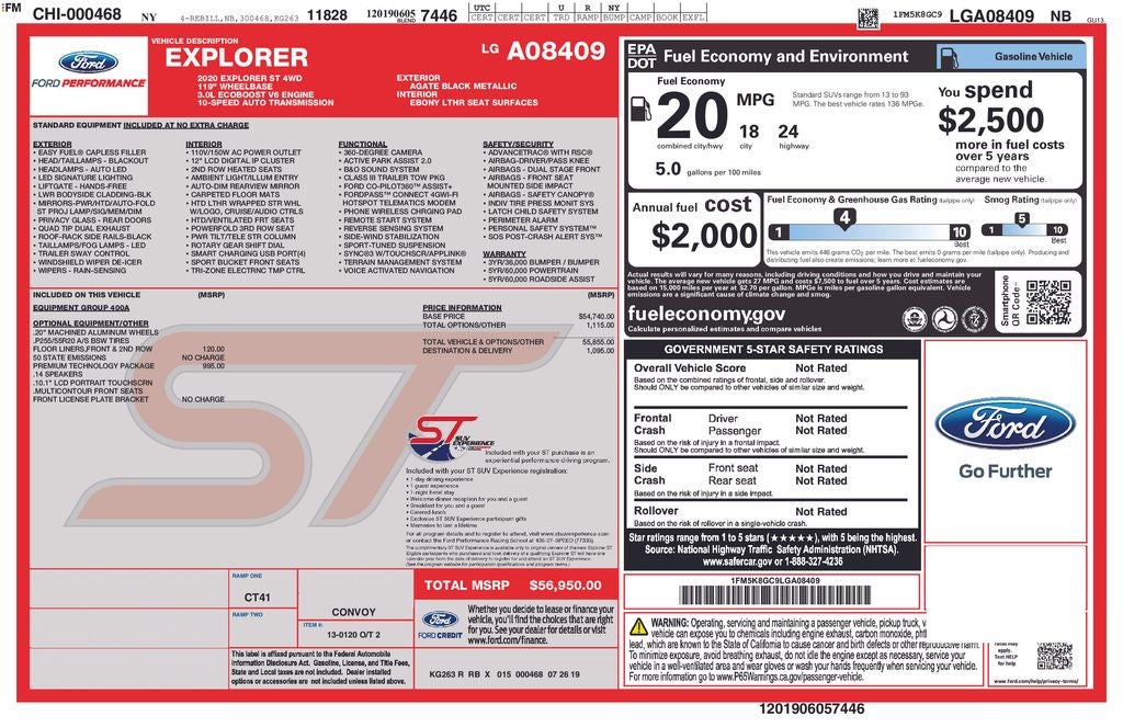 2020 Ford Explorer Black ST 4WD 10-Speed Automatic 3.0L EcoBoost V6 4WD, 10.1 LCD Capacitive Portrait Touchscreen, 12 Speakers, 2 Additional Speakers, 20 Machined Aluminum w/Painted Pockets Wheels, 3.58 Non-Limited-Slip Rear Axle Ratio, 3rd row seats: bench, 4-Wheel Disc Brakes, ABS brakes, Air Conditioning, Alloy wheels, AM/FM radio: SiriusXM, Auto High-beam Headlights, Auto-dimming door mirrors, Auto-dimming Rear-View mirror, Automatic temperature control, Brake assist, Bumpers: body-color, Compass, Delay-off headlights, Driver door bin, Driver vanity mirror, Dual front impact airbags, Dual front side impact airbags, Electronic Stability Control, Emergency communication system: SYNC 3 911 Assist, Equipment Group 400A, Exterior Parking Camera Rear, FordPass Connect, Four wheel independent suspension, Front & Second Row Floor Liners, Front anti-roll bar, Front Bucket Seats, Front Center Armrest, Front dual zone A/C, Front fog lights, Front reading lights, Fully automatic headlights, Garage door transmitter: HomeLink, Heated door mirrors, Heated front seats, Heated rear seats, Heated steering wheel, Illuminated entry, Knee airbag, Leather Htd/Ventilated Sport Captain's Chairs, Leather steering wheel, Low tire pressure warning, Memory seat, Navigation System, Occupant sensing airbag, Outside temperature display, Overhead airbag, Overhead console, Panic alarm, Passenger door bin, Passenger vanity mirror, Power door mirrors, Power driver seat, Power Liftgate, Power passenger seat, Power steering, Power windows, Premium Technology Package, Radio data system, Radio: B&O Sound System by Bang & Olufsen, Rain sensing wipers, Rear air conditioning, Rear anti-roll bar, Rear reading lights, Rear window defroster, Rear window wiper, Remote keyless entry, Roof rack: rails only, Security system, Speed control, Speed-sensing steering, Speed-Sensitive Wipers, Split folding rear seat, Spoiler, Sport steering wheel, Steering wheel memory, Steering wheel mounted audio controls, SYNC 3 Communications & Entertainment System, SYNC 3/Apple CarPlay/Android Auto, Tachometer, Telescoping steering wheel, Tilt steering wheel, Traction control, Trip computer, Turn signal indicator mirrors, Variably intermittent wipers, Ventilated front seats, Voice-Activated Touchscreen Navigation System.