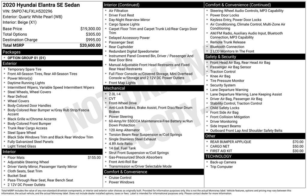 ** NEW TIRES ** NEW FRONT BRAKE PADS ** Quartz White Pearl 2020 Hyundai Elantra SE FWD CVT 2.0L 4-Cylinder DOHC 16V Air Conditioning, Delay-off headlights, Exterior Parking Camera Rear, Front Bucket Seats, Front dual zone A/C, Front reading lights, Outside temperature display, Panic alarm, Radio: AM/FM Audio System, Remote keyless entry, Speed control, Wheels: 15 x 6.0J Steel w/Covers. COMES WITH A WRITTEN FITZWAY CHECKOUT COVERING ALL MAJOR ITEMS! THE BEST GUARANTEE IN THE ENTIRE COUNTRY! DON'T PAY FOR A MISTAKE SOMEWHERE ELSE! No Added Market Adjustments or Hidden Fees! Transparency You Can Trust, That's The FitzWay! Please visit us at Fitzgerald Used Cars Clearwater between NE Coachman and Sunset Point RD on the north bound service rd. At 23499 US 19 N, Clearwater FL 33765. OR Contact a Sales Associate 727-799-1999. Recent Arrival! 30/40 City/Highway MPG