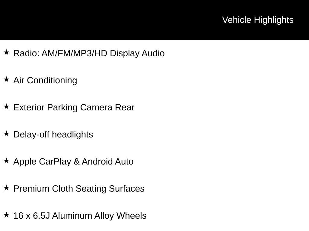 - Radio: AM/FM/MP3/HD Display Audio -inc: 8" color touchscreen, 6 speakers (2 front door mounted speakers, 2 tweeters and 2 rear speakers), integrated Bluetooth®, Apple CarPlay, Android Auto and USB charge port