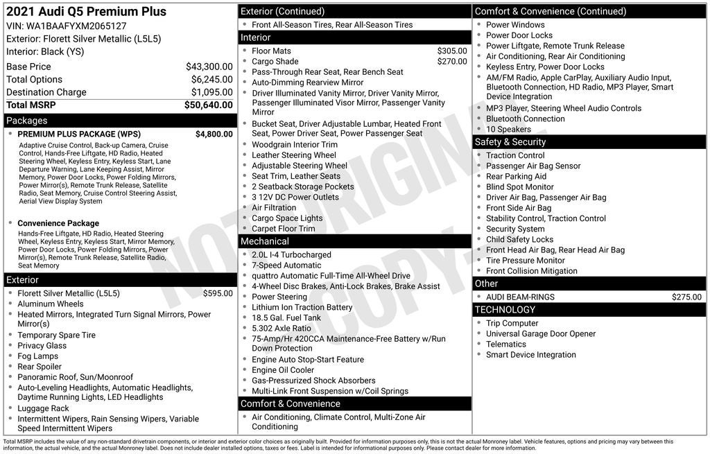 ** PANORAMIC SUNROOF ** 2021 Audi Q5 Florett Silver Metallic 45 Premium Plus quattro quattro 7-Speed Automatic S tronic 2.0L Turbocharged Black w/Leather Seating Surfaces, 10 Speakers, Adaptive Cruise Control w/Traffic Jam Assist, Audi Active Lane Assist, Audi Advanced Key, Audi Phone Box, Audi Virtual Cockpit Plus, Auto-Dimming Power Folding Exterior Mirrors, Convenience Package, Driver Seat Memory, Emergency communication system: Audi connect CARE, Exterior Parking Camera Rear, Front Bucket Seats, Front dual zone A/C, Front fog lights, Garage door transmitter: HomeLink, Hands-On Detection Steering Wheel, Heated front seats, Heated Steering Wheel, Leather Seating Surfaces, Leatherette Covered Center Console & Door Armrests, Outside temperature display, Panoramic Sunroof, Power driver seat, Power Liftgate, Power passenger seat, Premium Plus Package, Radio: Audi Sound System, Rain sensing wipers, Rear air conditioning, SiriusXM All Access Service, Top View Camera System, Wheels: 19 5-Double-Arm Design Bi-Color Finish.
