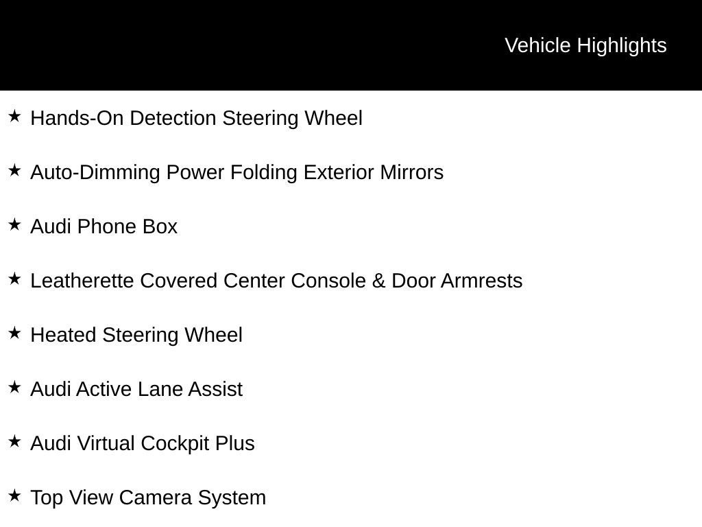 - Radio: Audi Sound System -inc: Audi smartphone interface w/wireless Apple CarPlay, preparation for mobile phone (Bluetooth®), MMI touch display w/10.1" center screen and 2 rear USB charge ports