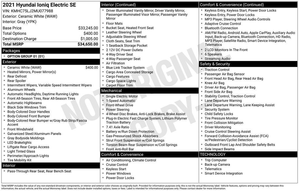 2021 Hyundai Ioniq Electric Ceramic White SE FWD 1-Speed Automatic Electric Motor AM/FM radio: SiriusXM, Apple CarPlay & Android Auto, Automatic temperature control, Brake assist, Electronic Stability Control, Exterior Parking Camera Rear, Heated Front Bucket Seats, Power steering, Power windows, Radio: AM/FM Display Audio, Security system, Steering wheel mounted audio controls, Wheels: 16 x 6.5J Aluminum Alloy (EV Design).