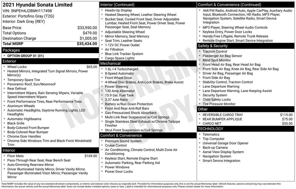 2021 Hyundai Sonata Portofino Gray Limited FWD 8-Speed Automatic with Overdrive I4 Dark Gray w/Leather Seating Surfaces, Apple CarPlay & Android Auto, Bose Premium Audio, Front dual zone A/C, Heads-Up Display, Leather Seating Surfaces, Memory seat, Navigation System, Power driver seat, Power moonroof, Power passenger seat, Radio: AM/FM/MP3/HD/SiriusXM Display Audio w/Nav, Wheels: 18 x 7.5J Aluminum Alloy, Wireless Device Charging.