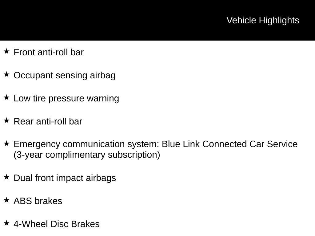 - Radio: AM/FM/SiriusXM Audio System -inc: 7" color touchscreen display audio system w/6 speakers, Android Auto and Apple CarPlay, USB/AUX outlets, Bluetooth® hands-free phone system, HD Radio, VR and Blue Link connected car system