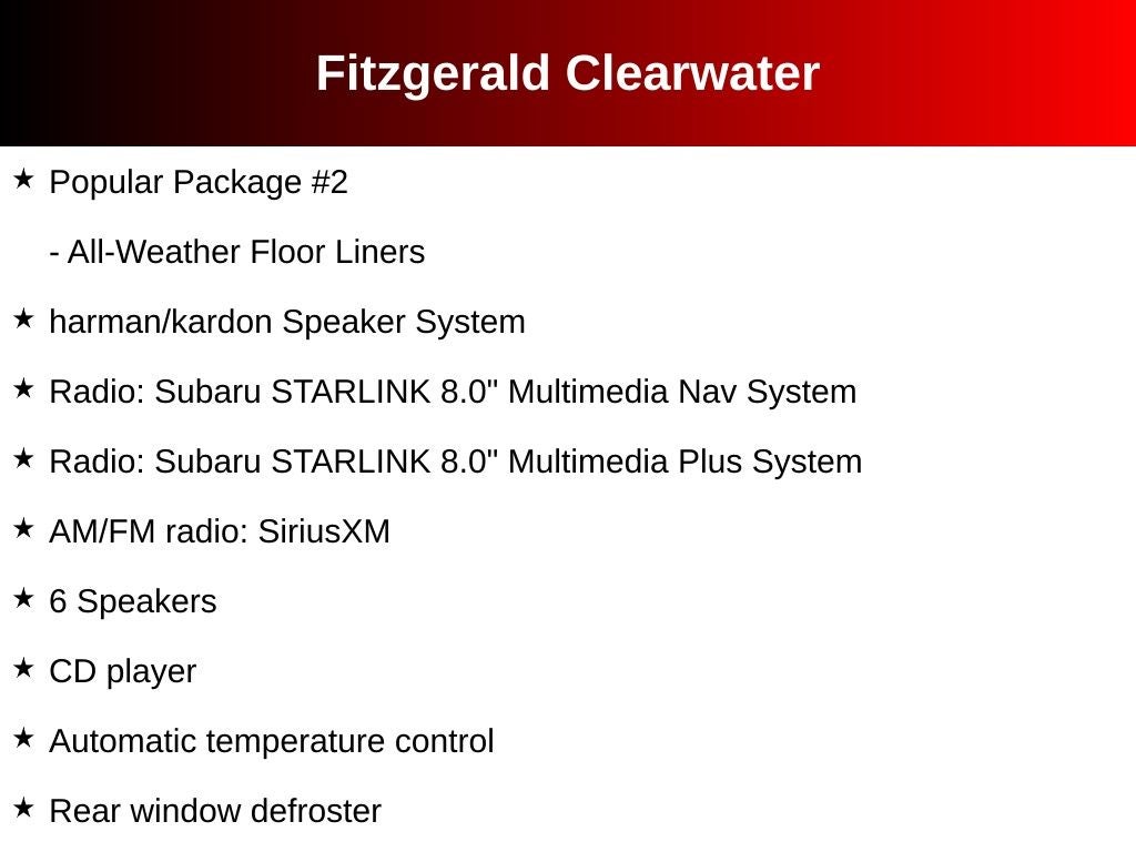 - Radio: Subaru STARLINK 8.0" Multimedia Plus System -inc: AM/FM stereo, HD Radio, single disc CD player w/MP3/WMA/CRR/RW file capability, multi-touch gesture high resolution display screen, voice activated controls, Bluetooth® audio streaming and hands-free phone connectivity, Bluetooth® hands-free SMS text messaging connectivity, Near Field Communication (NFC), iPod control capability, rear-vision camera display, SiriusXM All Access radio (4 months free trial/subscription required after), SiriusXM Travel Link (4 months free trial/subscription required after), smartphone integration: AHA, Android Auto, Apple CarPlay, Pandora, STARLINK cloud applications, 6 speakers, 3.5mm auxiliary input jack, dual USB input ports, dual USB input charge ports, roof mounted antenna and audio/satellite connected services