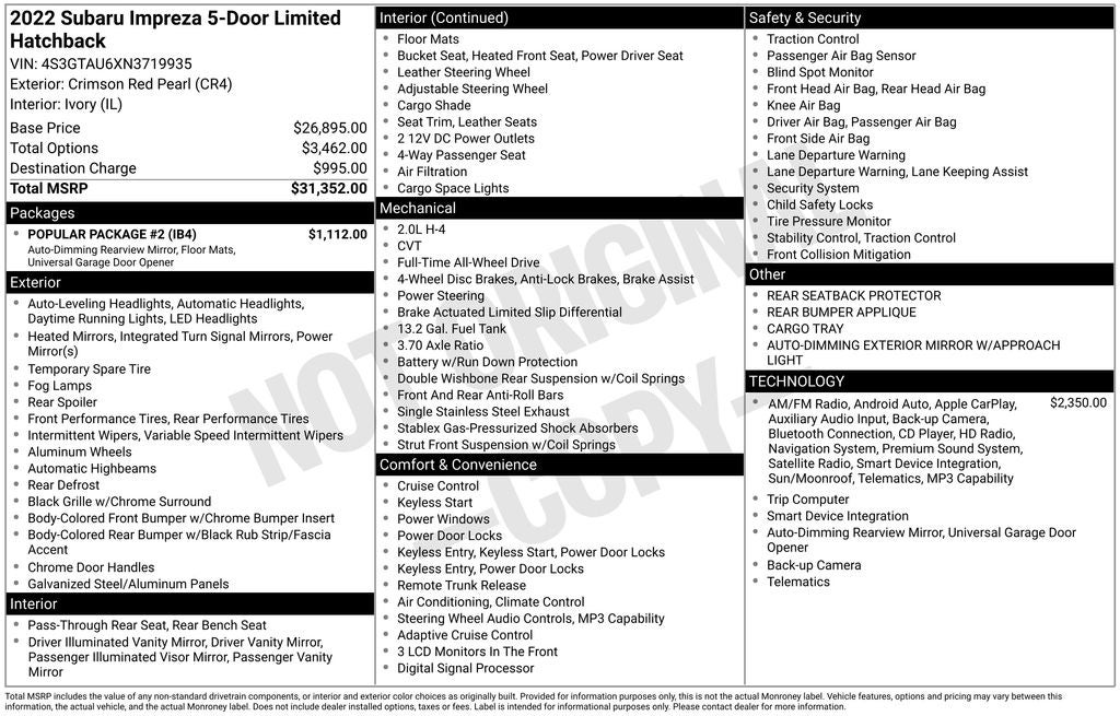 ** ONE OWNER ** MOONROOF ** LEATHER ** 2022 Subaru Impreza Crimson Red Pearl Limited AWD CVT Lineartronic 2.0L DOHC 6 Speakers, Active Cruise Control, All-Weather Floor Liners, Alloy wheels, AM/FM radio: SiriusXM, Anti-whiplash front head restraints, Auto High-beam Headlights, Auto-Dimming Exterior Mirror w/Approach Light, Auto-Dimming Mirror w/Compass & HomeLink, Automatic temperature control, Cargo Tray, CD player, Driver vanity mirror, Exterior Parking Camera Rear, Front anti-roll bar, Fully automatic headlights, harman/kardon Speaker System, Heated Front Bucket Seats, Knee airbag, Moonroof & Navi & H/K Audio, Outside temperature display, Panic alarm, Passenger vanity mirror, Perforated Leather-Trimmed Upholstery, Popular Package #2, Power driver seat, Power Moonroof, Radio: Subaru STARLINK 8.0 Multimedia Plus System, Rear anti-roll bar, Rear Seatback Protector, Rear window defroster, Rear window wiper, Remote keyless entry, Security system, STARLINK/Apple CarPlay/Android Auto, Steering wheel mounted audio controls, Telescoping steering wheel, Tilt steering wheel, Turn signal indicator mirrors, Variably intermittent wipers. Odometer is 21879 miles below market average! 28/36 City/Highway MPG