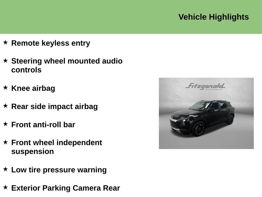 ** ONE OWNER ** Mosaic Black Metallic 2023 Chevrolet TrailBlazer LT FWD CVT 1.2L Ecotec Turbo DOHC DI w/VVT 2-Way Power Driver Lumbar Seat Adjuster, 6 Speakers, 6-Speaker Audio System Feature, 7 Diagonal Color Touchscreen, 8-Way Power Driver Seat Adjuster, Air Conditioning, Alloy wheels, Compass, Driver vanity mirror, Exterior Parking Camera Rear, Front anti-roll bar, Front fog lights, Front wheel independent suspension, Fully automatic headlights, Heated Driver & Front Passenger Seats, Heated front seats, Knee airbag, Low tire pressure warning, Panic alarm, Passenger vanity mirror, Power driver seat, Preferred Equipment Group 1LT, Radio: Chevrolet Infotainment 3 System, Rear side impact airbag, Rear window wiper, Remote keyless entry, Security system, SiriusXM Radio, Speed control, Steering wheel mounted audio controls, Telescoping steering wheel, Tilt steering wheel, Variably intermittent wipers, Wireless Apple CarPlay/Android Auto.