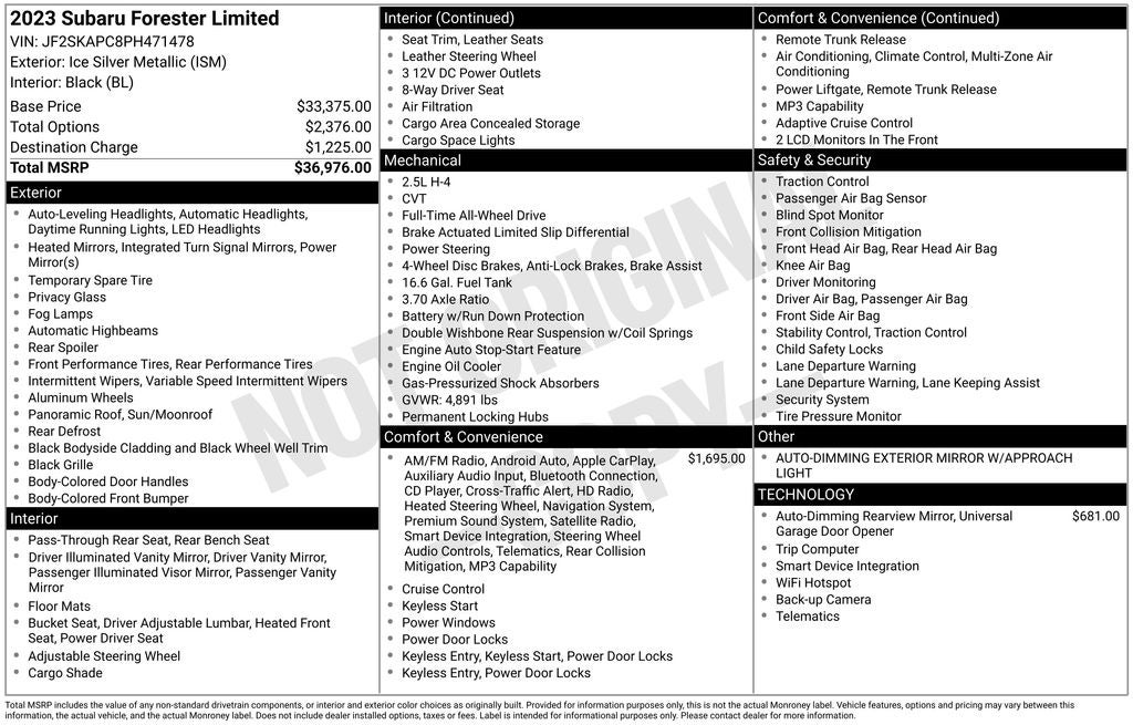 2023 Subaru Forester Ice Silver Metallic Limited AWD Lineartronic CVT 2.5L 4-Cylinder DOHC 16V 6 Speakers, Active Cruise Control, All-Weather Floor Liners, Alloy wheels, AM/FM radio: SiriusXM, Anti-whiplash front head restraints, Auto-Dimming Exterior Mirror w/Approach Light, Auto-Dimming Mirror w/Compass & HomeLink, Automatic temperature control, CD player, Driver vanity mirror, Exterior Parking Camera Rear, Front anti-roll bar, Front dual zone A/C, Front fog lights, Fully automatic headlights, harman/kardon 9-Speaker Audio System, Heated Front Bucket Seats, Heated Steering Wheel, Knee airbag, Leather Shift Knob, Low tire pressure warning, Nav & harman/kardon & RAB & Heated Steering Wheel, Navigation System, Outside temperature display, Panic alarm, Passenger vanity mirror, Perforated Leather-Trimmed Upholstery, Power Liftgate, Power moonroof: Panoramic, Radio: Subaru Starlink 8.0 Multimedia Nav System, Rear anti-roll bar, Rear window defroster, Rear window wiper, Remote keyless entry, Reverse Automatic Braking System (RAB), Security system, Speed control, Steering wheel mounted audio controls, Telescoping steering wheel, Tilt steering wheel, Turn signal indicator mirrors, Variably intermittent wipers.
