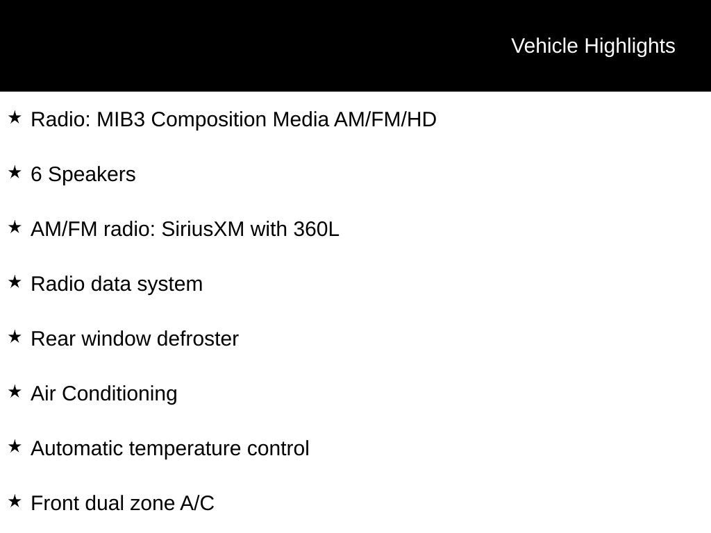 - Radio: MIB3 Composition Media AM/FM/HD -inc: 8" touchscreen, WMA/MP3/FLAC player w/USB-C, voice control, 6-speaker sound system, Qi wireless inductive charger (for compatible mobile phones and accessories), App-Connect smartphone integration (w/Apple CarPlay, Android Auto and MirrorLink) via USB, Wireless App-Connect smartphone integration (for compatible devices) w/multi-phone pairing capability, capability for in-vehicle 4G LTE enabled Wi-Fi (cellular data plan required; includes limited trial), capability for VW Car-Net services (capabilities for certain services vary; requires enrollment or subscription), Bluetooth® connectivity (for compatible devices) and SiriusXM w/360L (w/3-month free trial subscription; 360L services require acceptance of Car-Net terms)