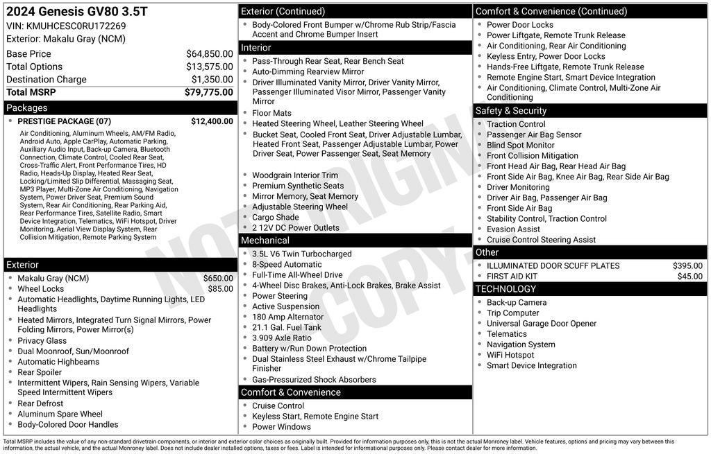 2024 Genesis GV80 Makalu Gray 3.5T AWD 8-Speed Automatic 3.5L DOHC 12.3 3D Digital Instrument Cluster, 3-Zone Climate Control, Advanced Package, Android Auto & Apple CarPlay, Blind-Spot View Monitor, Emergency communication system: Genesis Connected Services, Ergo Motion Driver Seat, Exterior Parking Camera Rear, Front Bucket Seats, Front dual zone A/C, Head-Up Display, Heated & Ventilated Front Bucket Seats, Heated 2nd Row Seats, Leather Seating Surfaces, Memory seat, Nappa Leather Seating Surfaces, Navigation System, Option Group 06, Power Cushion Extension & Bolster, Power driver seat, Power moonroof, Power passenger seat, Prestige Package, Radio: AM/FM/SiriusXM/HD Lexicon Prem Audio System, Radio:14.5 Navigation System w/AM/FM/HD Radio, Rear air conditioning, Remote Smart Parking Assist, Reverse Parking Collision-Avoidance Assist, Surround View Monitor, Ventilated front seats, Wheels: 22 x 9.5J Alloy.