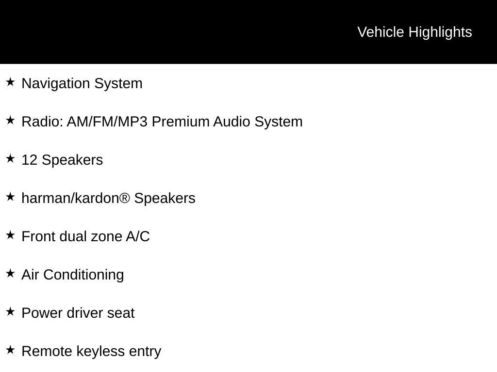 - Radio: AM/FM/MP3 Premium Audio System -inc: 630-Watts, Harman Kardon audio system w/12-speakers, Quantum Logic Surround, Clari-Fi, 12.3" color touchscreen display, onboard navigation w/traffic flow including incident data via HD Radio (HERE), Over-the-Air (OTA) map updates, SiriusXM, Android Auto and Apple CarPlay, USB, dynamic voice recognition, rear seat quiet mode, passenger talk (in-car intercom), Bluetooth® hands-free connectivity w/multiple device connection and Bluelink Connected Car System