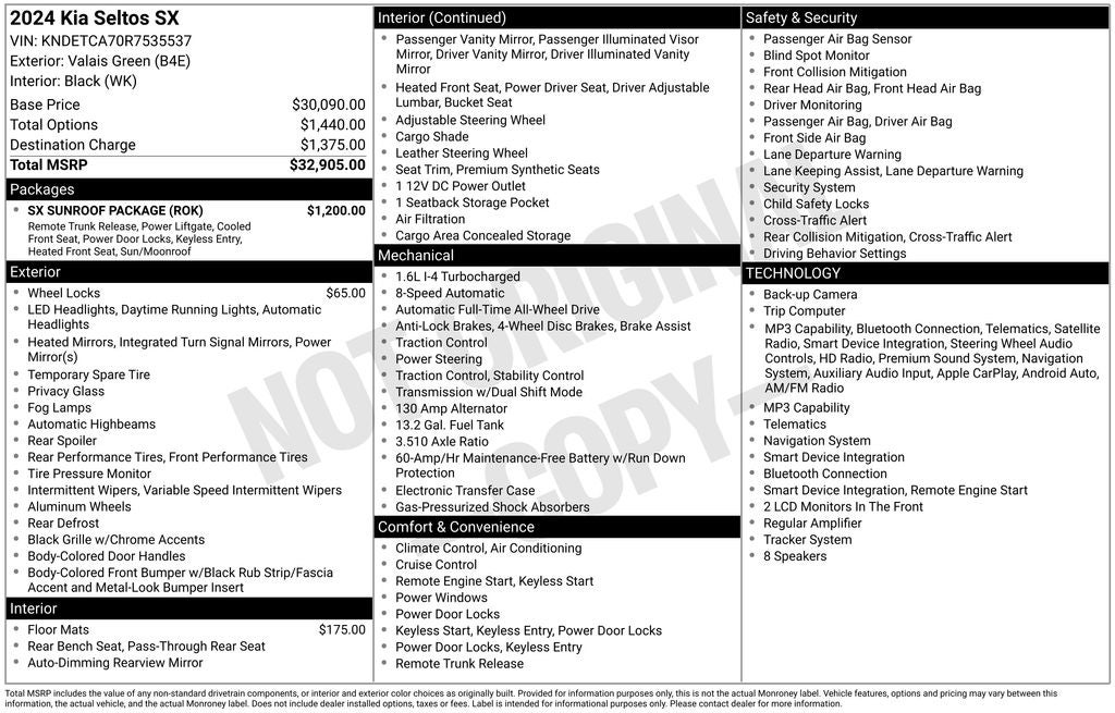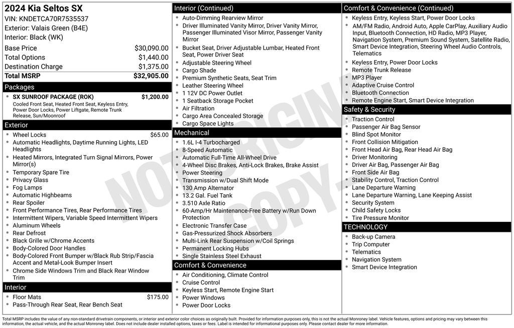 Powered by a capable I4 engine and equipped with all-wheel drive, the 2024 Kia Seltos SX delivers impressive performance and all-weather confidence. With a fuel-efficient 25 city / 27 highway MPG rating, this crossover offers the perfect balance of power and efficiency.