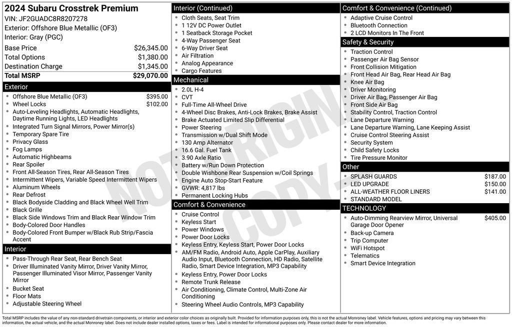 2024 Subaru Crosstrek Offshore Blue Metallic Premium AWD Lineartronic CVT 2.0L 4-Cylinder DOHC 16V 6 Speakers, Active Cruise Control, All-Weather Floor Liners, Alloy wheels, Anti-whiplash front head restraints, Auto-Dimming Mirror w/Compass & HomeLink, Automatic temperature control, Driver vanity mirror, Exterior Parking Camera Rear, Front dual zone A/C, Front fog lights, Heated Wipers, Knee airbag, Low tire pressure warning, Outside temperature display, Panic alarm, Passenger vanity mirror, Radio: Subaru STARLINK 11.6 Multimedia Plus Sys, Rear anti-roll bar, Rear window wiper, Remote keyless entry, Security system, Split folding rear seat, STARLINK/Apple CarPlay/Android Auto, Steering wheel mounted audio controls, Telescoping steering wheel, Tilt steering wheel, Turn signal indicator mirrors, Variably intermittent wipers.