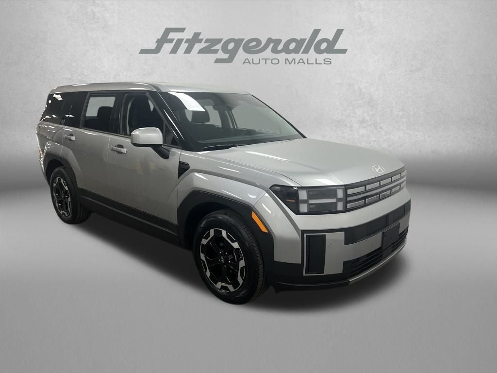 2025 Hyundai Santa Fe Shimmering Silver Pearl SE FWD Shiftronic 2.5L I4 Black Cloth, 18 x 7.5J Alloy Wheels, 3rd row seats: bench, 4-Wheel Disc Brakes, 6 Speakers, ABS brakes, Air Conditioning, Alloy wheels, AM/FM radio: SiriusXM, Apple CarPlay & Android Auto, Auto High-beam Headlights, Brake assist, Bumpers: body-color, Cargo Tray, Carpeted Floor Mats, Delay-off headlights, Driver door bin, Driver vanity mirror, Dual front impact airbags, Dual front side impact airbags, Electronic Stability Control, Emergency communication system, Exterior Parking Camera Rear, First Aid Kit, Four wheel independent suspension, Front anti-roll bar, Front Bucket Seats, Front Center Armrest, Front reading lights, Fully automatic headlights, Heated door mirrors, Illuminated entry, Knee airbag, Leather steering wheel, Low tire pressure warning, Occupant sensing airbag, Option Group 01, Outside temperature display, Overhead airbag, Overhead console, Panic alarm, Passenger door bin, Passenger vanity mirror, Power door mirrors, Power Liftgate, Power steering, Power windows, Radio: AM/FM/HD Display Audio, Rear anti-roll bar, Rear seat center armrest, Rear side impact airbag, Rear window defroster, Rear window wiper, Remote keyless entry, Security system, Speed control, Speed-sensing steering, Split folding rear seat, Spoiler, Steering wheel mounted audio controls, Tachometer, Telescoping steering wheel, Tilt steering wheel, Tow Hitch, Traction control, Trip computer, Variably intermittent wipers, YES Essentials Stain-Resistant Cloth Seat Trim.